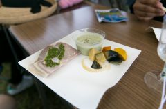 さて、急に開けた場所に出た。天神山のふもとに広がる丸小山公園だ。かつて天神山には、直江兼続の弟、大国実頼が治めた天神山城があった。歴史ロマンあふれる場所で第2のガストロノミー。「枝豆の冷製スープ、越後もち豚のローストポーク」だ。冷製スープは、枝豆の豊かな香りと風味が特徴である。越後もち豚は、柔らかく、特性ソースとの相性が抜群だ。味はもとより、盛り付けも素敵であり、それが食事をより一層楽しいものにしていた。